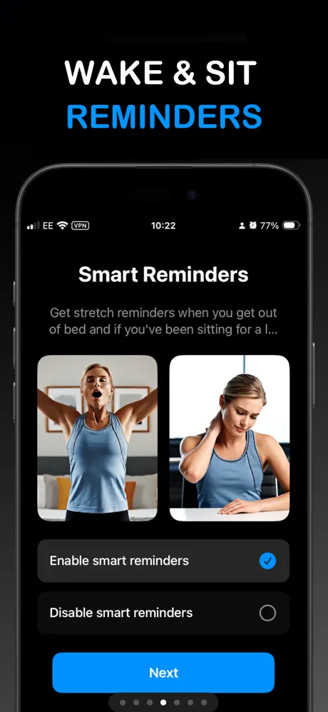One of NextStretch’s most helpful features is its smart stretch reminders, which encourage users to take movement breaks when they’ve been sitting for too long. These notifications help interrupt long periods of inactivity and prompt quick stretching sessions that can relieve stiffness and improve circulation. Paired with guided demonstrations and countdown timers, this feature turns stretching into a simple daily habit rather than something you forget to do at the end of the day.